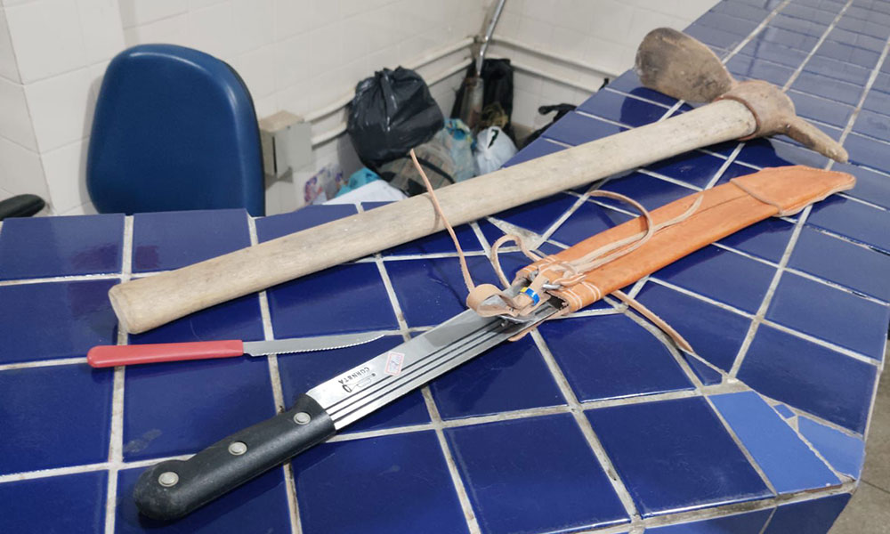 Ao chegar ao local, os militares se depararam com um Senhor de 56 anos, em aparente estado de embriaguez alcoólica, com uma caixa de som emitindo elevado ruído sonoro na porta de sua residência, de posse de um facão, uma faca e uma picareta, que eram usados para ameaçar vizinhos e familiares.